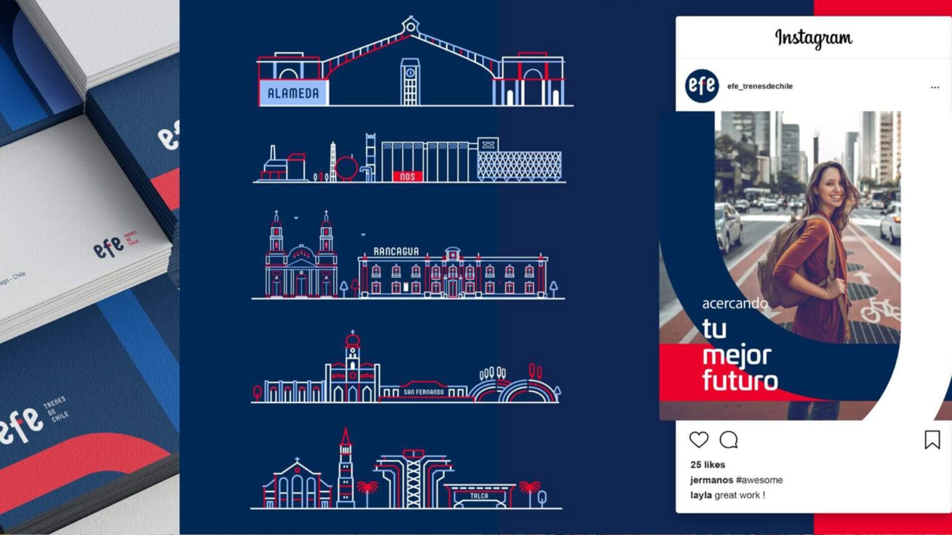 Además, EFE buscaba redefinir sus valores y posicionamiento para destacar atributos como modernidad, confiabilidad y conexión regional. El desafío consistía en desarrollar una identidad visual que no solo unificara las distintas filiales, sino que también posicionara a EFE como un referente en el transporte ferroviario, alineado con las expectativas de sus usuarios.